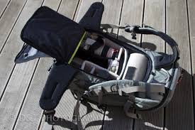 There�s an interior pocket for either a hydration sleeve (a good idea) or a laptop (not such a good idea). As mentioned, there are exterior pockets as well. If you travel often as I do, you will also be happy to know that the Tilopa�s size meets the legal requirements for carry-on status for most major airlines. I�ve also found that it fits nicely in the overhead compartments of at least the larger jets. With the Tilopa, you access your camera gear through the back of the pack, between the shoulder straps. Once again, this runs counter to how most of the other photo packs are designed. When you set your pack down on the ground to access your gear, the straps and back panel are facing up toward you instead of being exposed to the water, mud, sand, snow, and dirt. Oh, you photograph in those places too? Your gear is accessed from the back of the Tilopa Also, if I want to quickly grab something from the ICU, I don�t have to unstrap the tripod from the pack, which is necessary with most of the other front-loading photo packs.